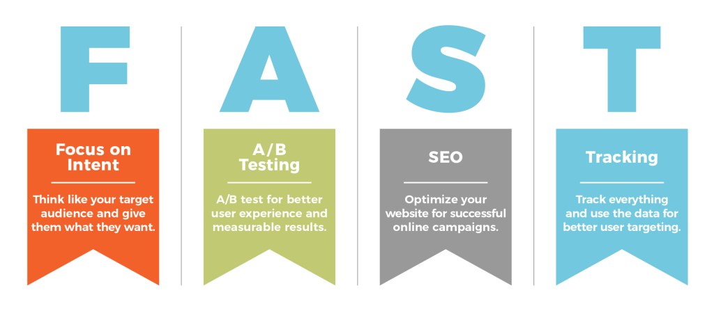 SEM started out as a combination of both paid ads and Search Engine Optimizations (SEO). Over time, SEM has evolved into marketing for search engines using paid ads only. There are vast amounts of information out there on this subject matter and it can get daunting at times. To help clients understand the process, I have narrowed it down to a simple four-step explanation – the FAST Approach – Focus on Intent, A/B Testing, SEO and Tracking.